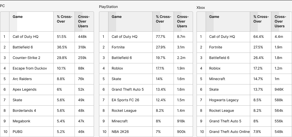 The biggest difference is with Call of Duty. Compared with Battlefield 6, Arc Raiders (which is an extraction shooter) had a relatively low cross-over with COD, just 11% on PS5 and 13% on Xbox (and like Battlefield 6, a very small cross-over on Steam).