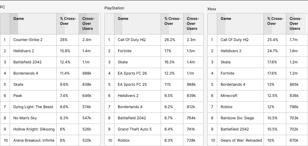 This suggests that Arc Raiders was particularly popular with players that like to experience a variety of different games and are more likely to hop around from title to title. It did appeal to players of legacy live service games, too, but not as much as Battlefield 6 did. Perhaps an illustration of this is on Steam. The No.1 game cross-over for both Arc Raiders and Battlefield 6 on Steam was with Counter-Strike 2. However, just 17% of Arc Raiders players were on Counter-Strike 2 the month prior, compared with 28% of Battlefield 6 users.