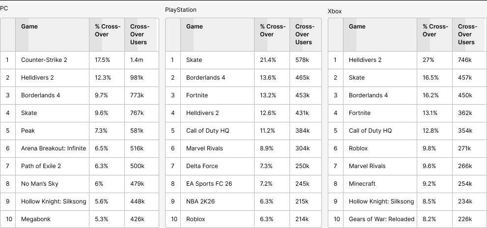 Indeed, Arc Raiders primarily disrupted more recent games. On PlayStation, 21% of Arc Raiders players had played Skate the month before, with 13.6% playing Borderlands 4, which were both released in September. On Xbox it’s a similar situation, the game with the most cross-over with Arc Raiders was Helldivers 2 (that game released on Xbox at the end of August), Skate and Borderlands 4.