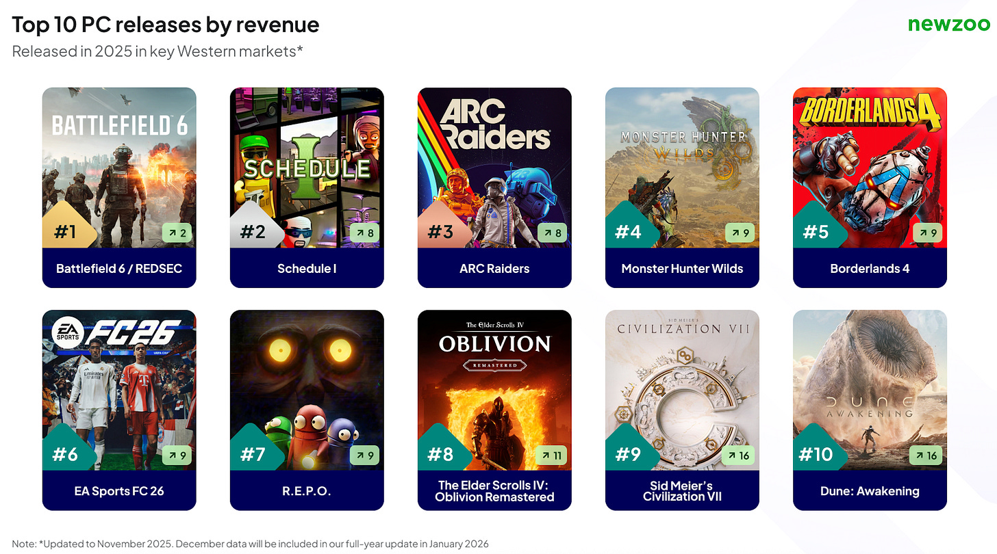 In terms of the top games (January – November 2025), the PC platform has by far the most interesting games chart (key Western markets only). In terms of revenue, the best-selling games include AAA hits like Battlefield 6, Monster Hunter Wilds, Borderlands 4 and EA Sports FC26, mixed with new IP, indie games and AA titles such as Schedule 1, Arc Raiders and REPO. It’s a real diverse mix of games, all at different price points, and launching at different times of the year.