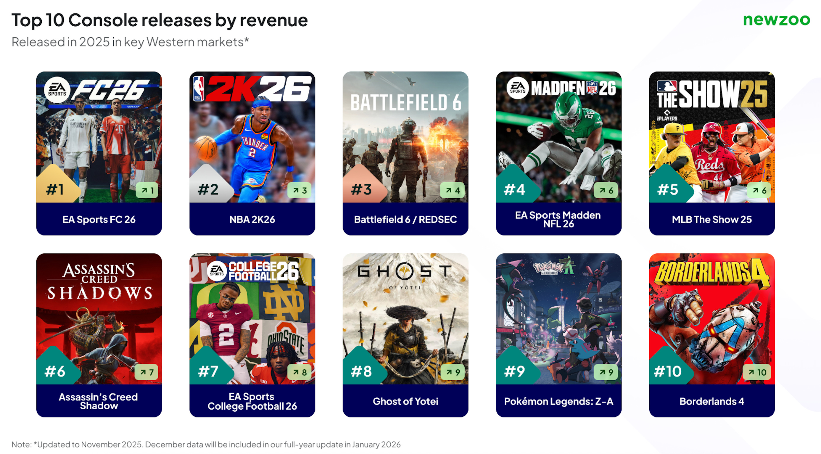 On console, however, the revenue chart is more traditional, featuring established AAA franchises such as Battlefield, Assassin’s Creed, Ghost of Yotei and Pokémon.